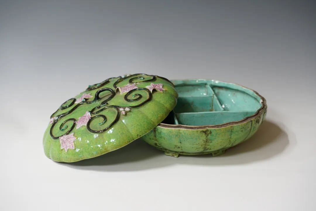 Emerald-green-glazed ceramic pigment box in the shape of a melon, Qing Dynasty, from the collection of the Huzhou Museum [Photo/Official WeChat account of the Yangzhou Museum]