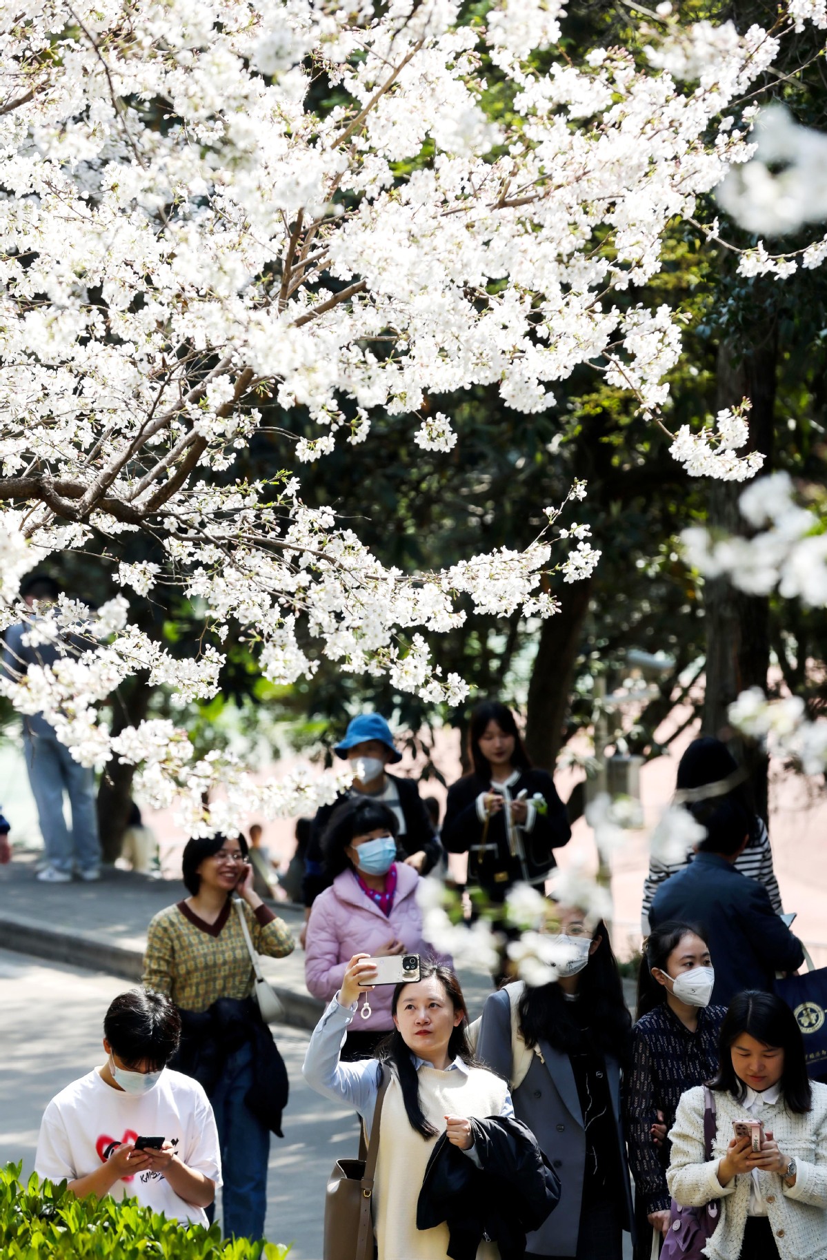 Tourists admire cherry blossoms at Wuhan University in Wuhan, Hubei province, on March 15, 2023. [Photo by Zhao Jun/for chinadaily.com.cn]