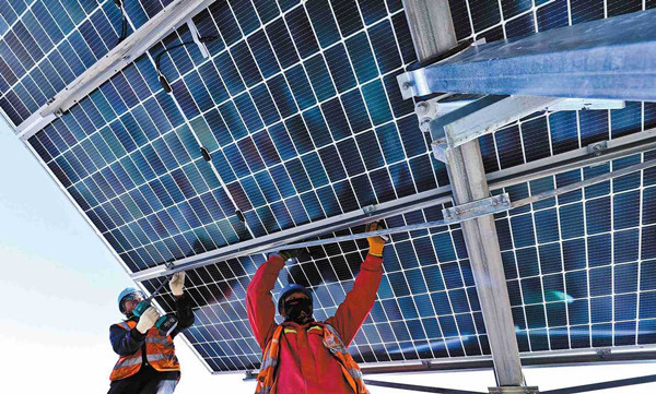 Workers install photovoltaic panels at a power farm in Zhangye, Gansu province, in November. [WANG JIANG/FOR CHINA DAILY]