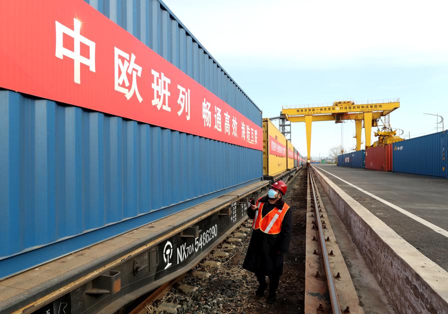 A China-Europe freight train, the first of its kind from the capital, left Mafang Station in Beijing's Pinggu district at 9:20am on Thursday. [Photo by Zou Hong/China Daily]
