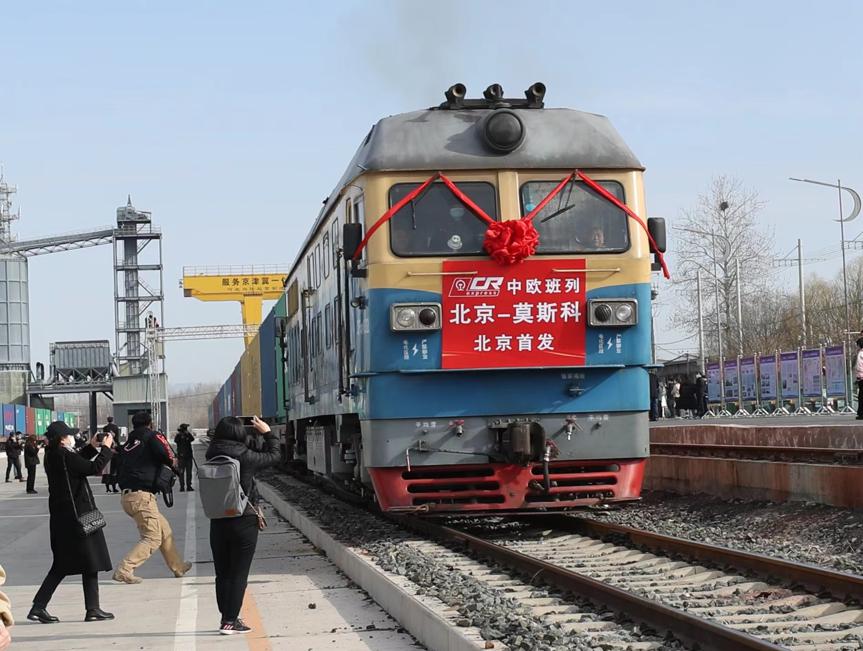 A China-Europe freight train, the first of its kind from the capital, left Mafang Station in Beijing's Pinggu district at 9:20am on Thursday. [Photo by Zou Hong/China Daily]
