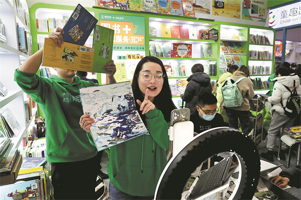 Staff members of a company recommend books via livestream at the start of the fair. [Photo provided by Wang Zhuangfei/China Daily]
