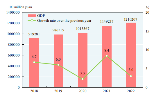 According to preliminary estimation, the gross domestic product (GDP) in 2022 was 121,020.7 billion yuan, up by 3.0 percent over the previous year.