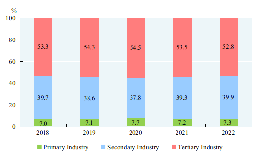 Shares of the Three Industries' Value Added of GDP 2018-2022. [Source: National Bureau of Statistics]