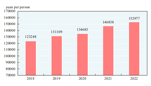 The per capita GDP in 2022 was 85,698 yuan, up by 3.0 percent over the previous year. The gross national income in 2022 was 119,721.5 billion yuan, up by 2.8 percent over the previous year. The overall labor productivity was 152,977 yuan per person, up by 4.2 percent over the previous year.
