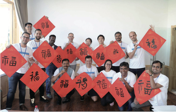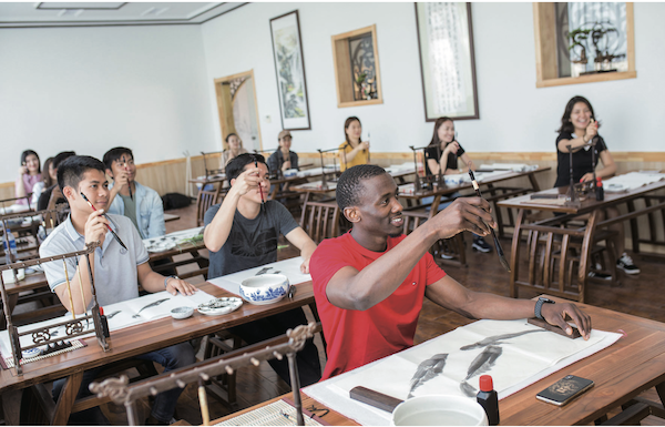 International students learn Chinese calligraphy. [Photo provided to chinadaily.com.cn]