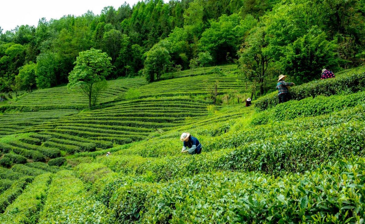 Farmers are busy picking tea-leaves in a tea garden Shennongjia, Hubei province. [Photo/provided to chinaservicesinfo.com]