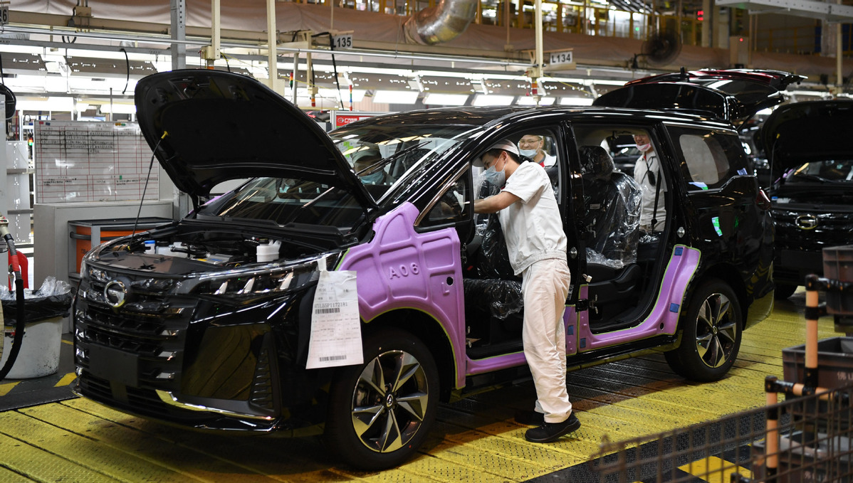 Employees work at the assembly lines of GAC Motor, in Guangzhou of Guangdong province, March 20, 2023. [photo/Xinhua]
