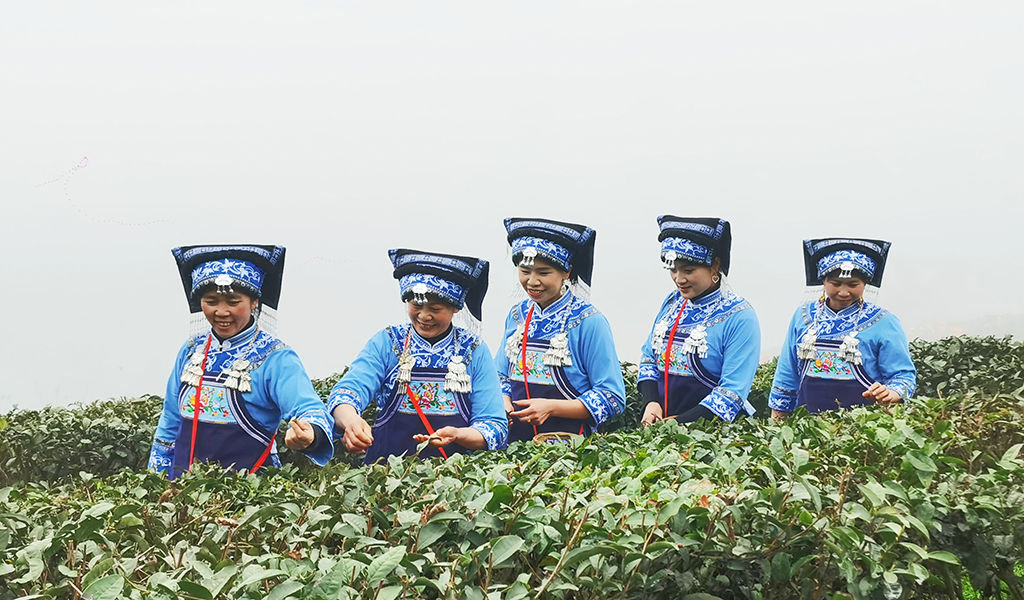 Women pick the tea leaves of Duyun Maojian in Maojian town, Duyun city, Guizhou province. [Photo/Dunyuan Convergence Media Center]
