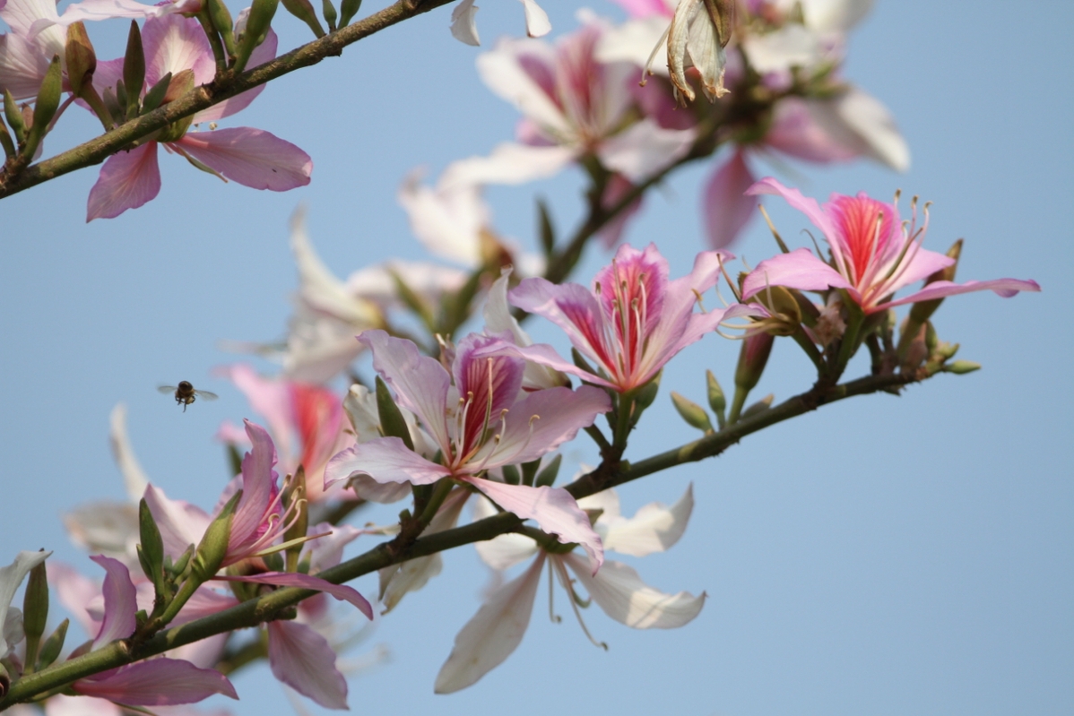 The flowers, with leaves similar to sheep's feet and petals like butterflies, typically blossom from March to May. There are large seas of Bauhinia variegata along the streets, parks, communities, foot paths and gardens, to create romantic spring scenery.
