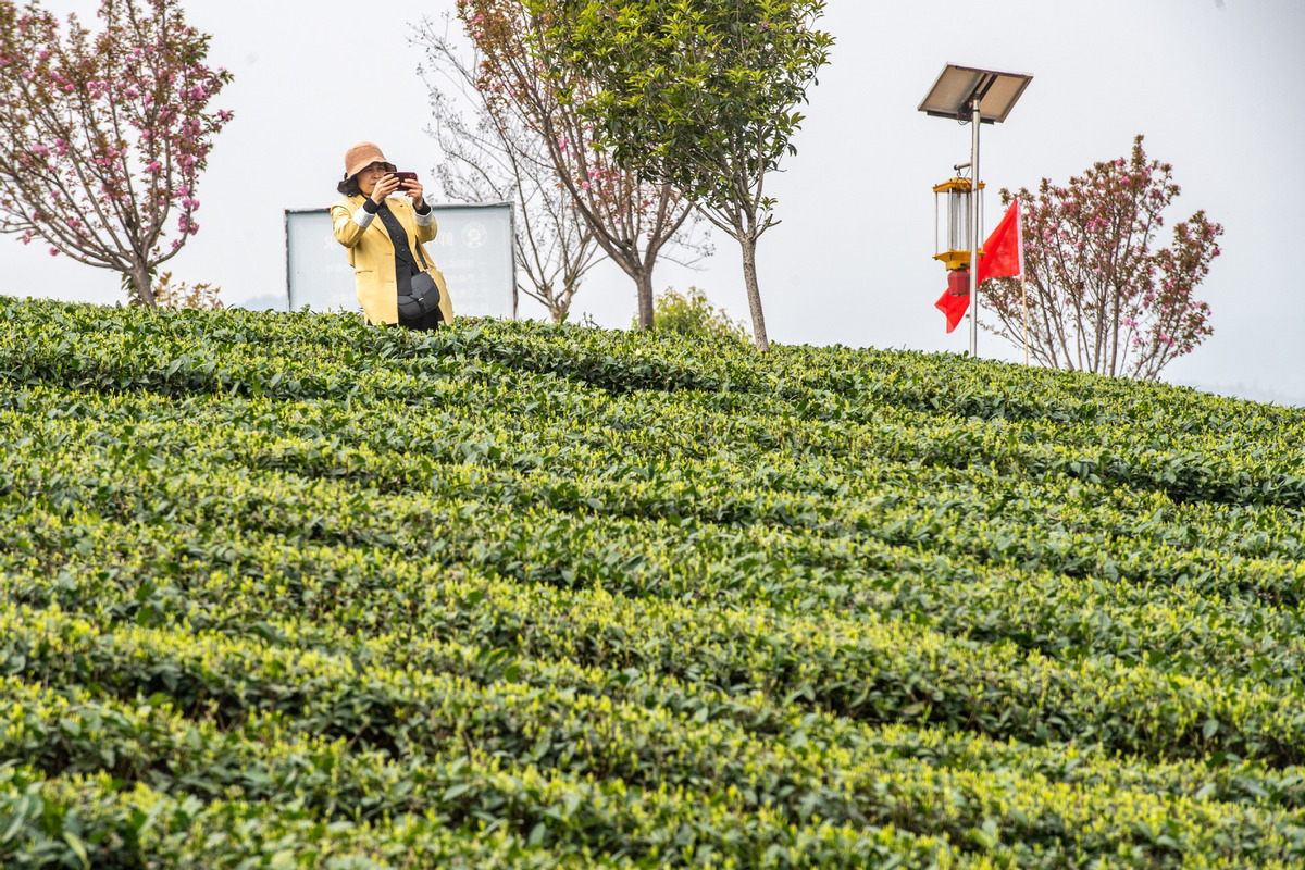 A tourist takes photos at a tea farm in Yongchuan district of Chongqing on March 22. [Photo/Xinhua]