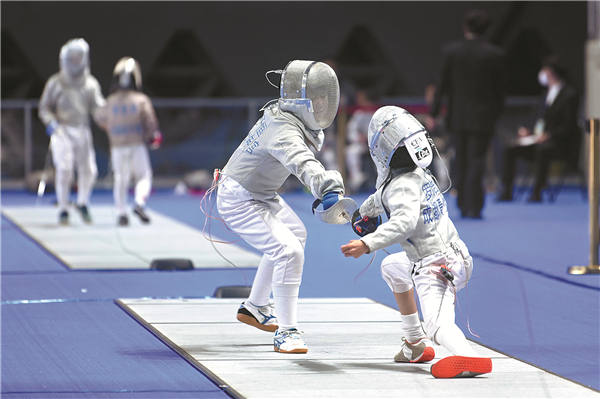 Fencers cross swords during a full-scale drill for the 31st Summer World University Games. [Photo provided to China Daily]