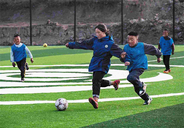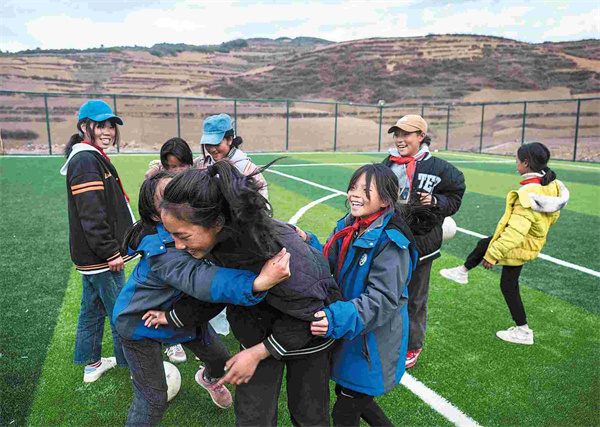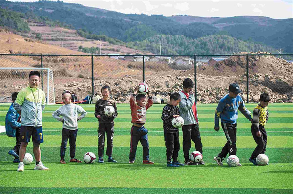 Amid the flowery Daliangshan Mountains of Zhaojue county in Liangshan Yi autonomous prefecture, Sichuan province, a group of children are playing on the new soccer field at Wawu Primary School.