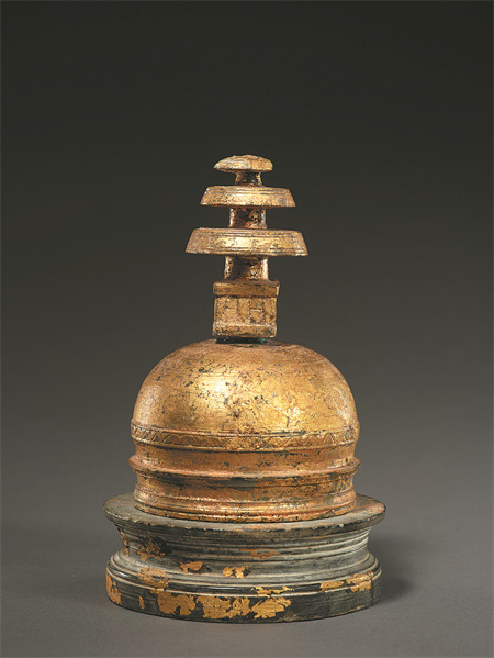 A gold stupa-shaped Buddha reliquary on display at the ongoing exhibition. [Photo provided to China Daily]