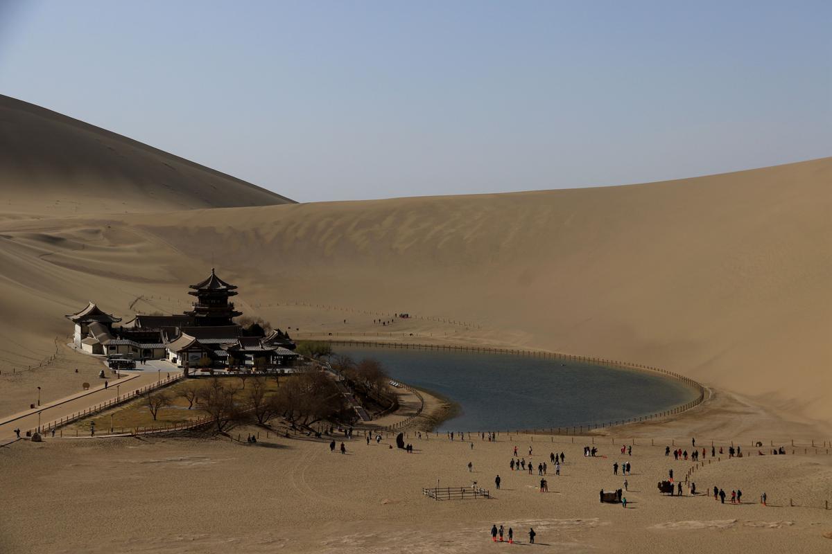 Tourists visit Mingsha Mountain and Yueya Spring in Dunhuang, Gansu province, on Saturday. [Photo by Zhang Xiaoliang/For chinadaily.com.cn]