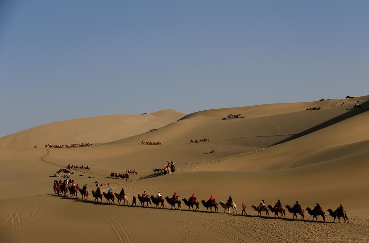 Tourists ride camels at Mingsha Mountain and Yueya Spring in Dunhuang, Gansu province, on Saturday. [Photo by Zhang Xiaoliang/For chinadaily.com.cn]
