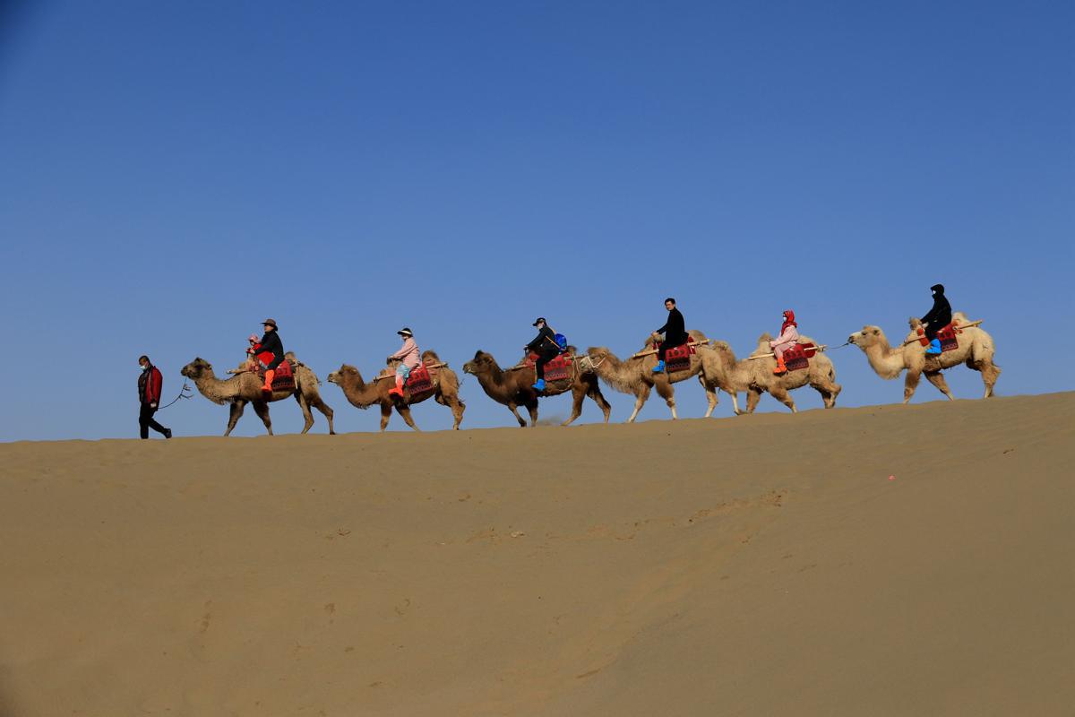 Tourists ride camels at Mingsha Mountain and Yueya Spring in Dunhuang, Gansu province, on Saturday. [Photo by Zhang Xiaoliang/For chinadaily.com.cn]