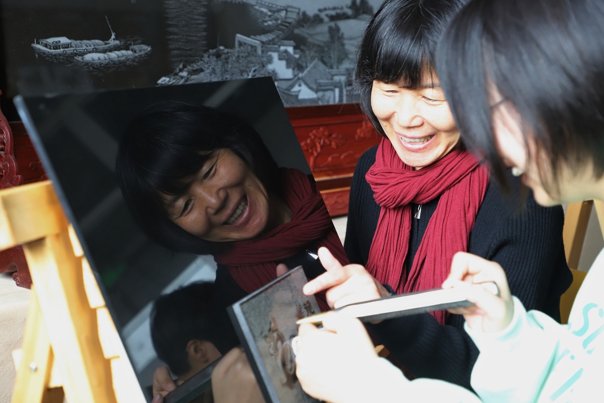 Fang Shiying instructs an apprentice doing stone shadow carving work in Wuqiao county of Cangzhou, Hebei province. [Photo by Ma Tianlong/For chinadaily.com.cn]