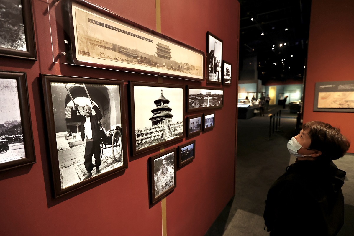 A visitor admires old photographs of the Central Axis. [Photo/IC]
