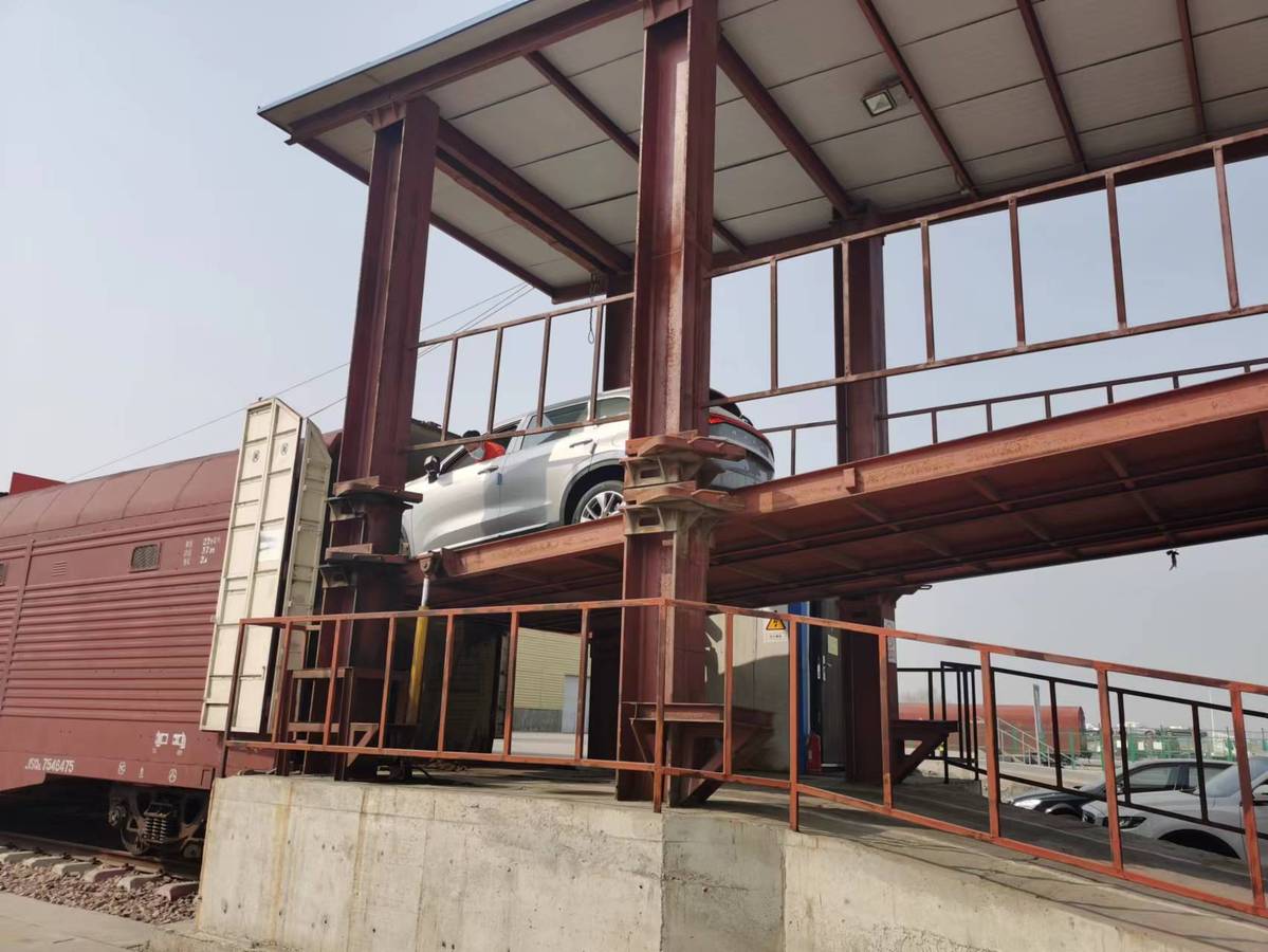 An SUV is driven into a train compartment on Tuesday at Shijiazhuang International Land Port. [Photo provided to chinadaily.com.cn]