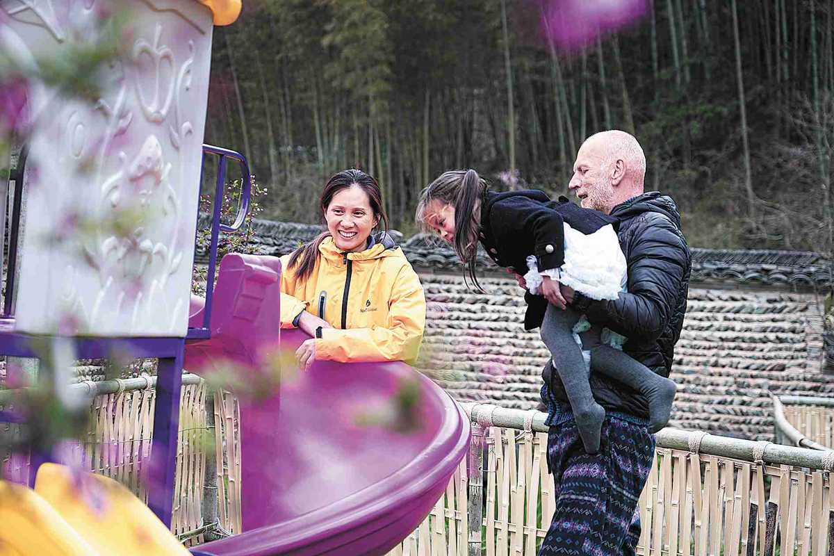 The family of Armin Schober, the Austrian owner of Alina's Garden, a Huizhou-style homestay, enjoys their leisure time in Yixian county, Huangshan, Anhui province. [Photo provided to China Daily]