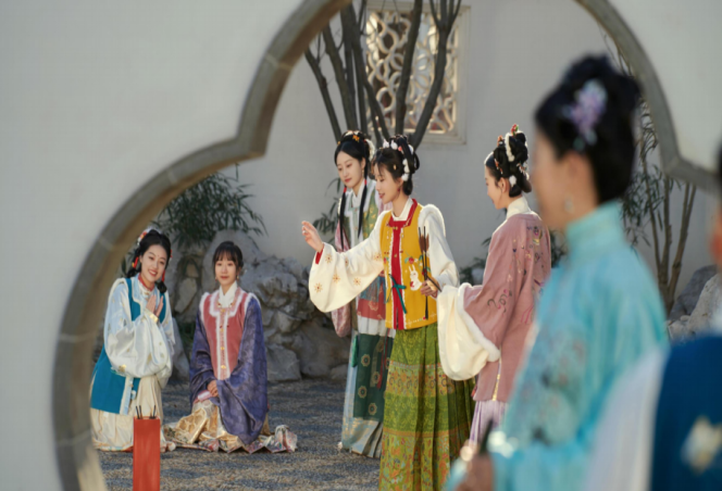 Women wear hanfu, a traditional Chinese style of clothing, at the Beijing Garden Expo in Fengtai district. [Photo provided to chinaservicesinfo.com]
