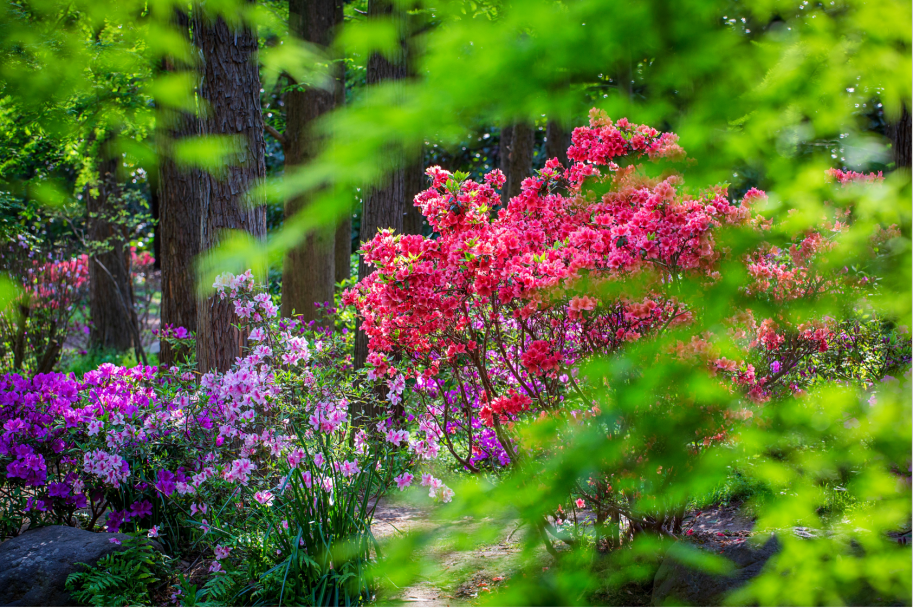 Purple and pink azalea blossoms bloom at the Shanghai Gongqing Forest Park. [Photo/Official WeChat account of Shanghai Gongqing Forest Park]