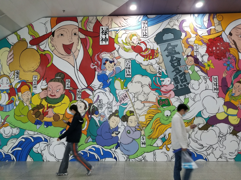 If you’ve been into the underpass at Beijing’s Guomao intersection (between the south-east corner under the bus station to exit C of the subway station) recently, you have probably noticed this massive mural on the wall at the western end. It’s entitled ‘The Gods go to Work’ and this explosion of colour is full of recognisable – and not so recognisable – homages to Chinese and specifically Beijing culture, both traditional and modern. But what does it all mean and why is it at Guomao?