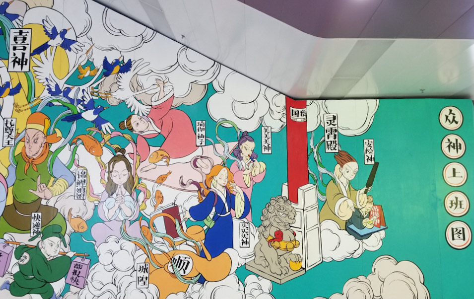 Wen Na, the creator, graduated from the Academy of Art and Design at Tsinghua University. She is part of the ‘post 1980s generation’, and hopes that everyone will see something of themselves in the mural. She says “todays’ office workers are also the eight immortals who cross the sea and show their magic powers. I think everyone is their own god”.