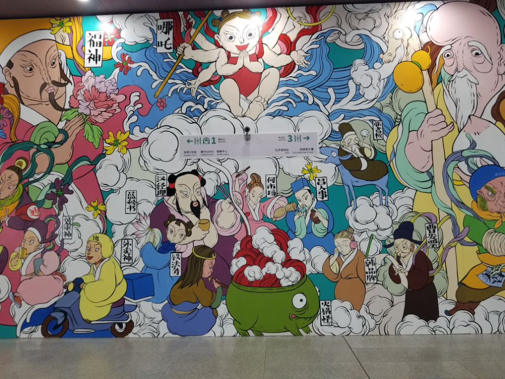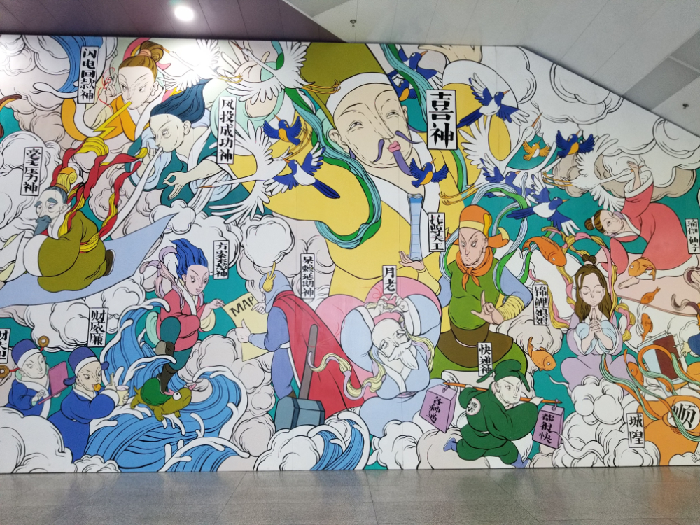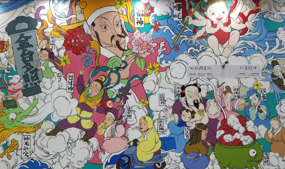 If you’ve been into the underpass at Beijing’s Guomao intersection (between the south-east corner under the bus station to exit C of the subway station) recently, you have probably noticed this massive mural on the wall at the western end. It’s entitled ‘The Gods go to Work’ and this explosion of colour is full of recognisable – and not so recognisable – homages to Chinese and specifically Beijing culture, both traditional and modern. But what does it all mean and why is it at Guomao?