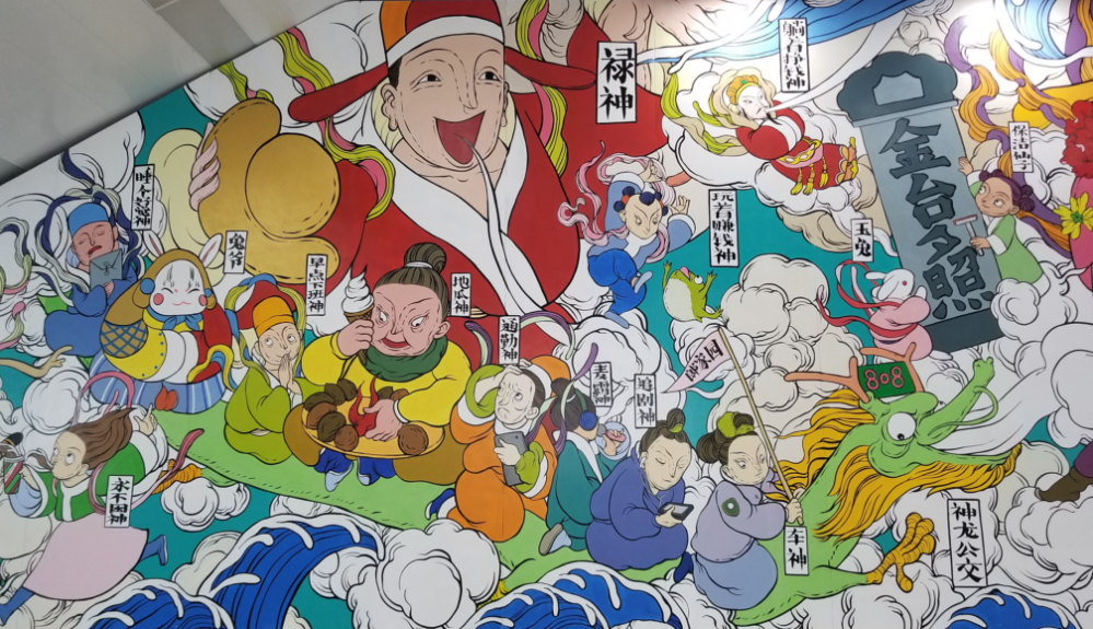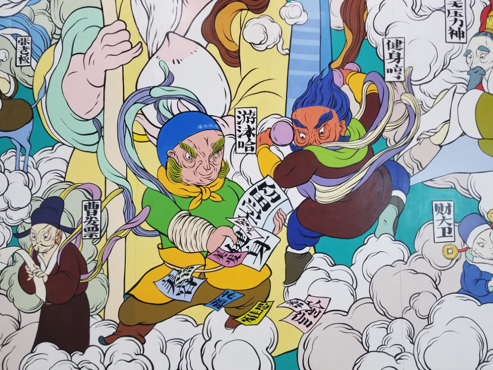 Wen Na, the creator, graduated from the Academy of Art and Design at Tsinghua University. She is part of the ‘post 1980s generation’, and hopes that everyone will see something of themselves in the mural. She says “todays’ office workers are also the eight immortals who cross the sea and show their magic powers. I think everyone is their own god”.