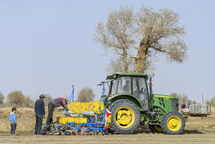 Cotton farmers prepare a seeding machine for spring sowing in Yuli county, Northwest China's Xinjiang Uygur autonomous region, March 30, 2023. [Photo/Xinhua]