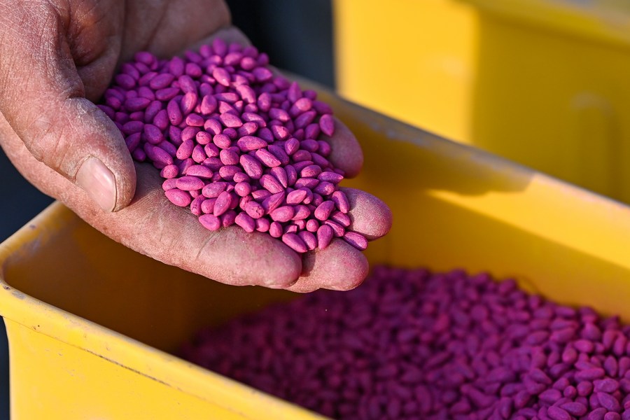 A farmer checks cotton seeds in Markit county, Northwest China's Xinjiang Uygur autonomous region, April 2, 2023. [Photo/Xinhua]