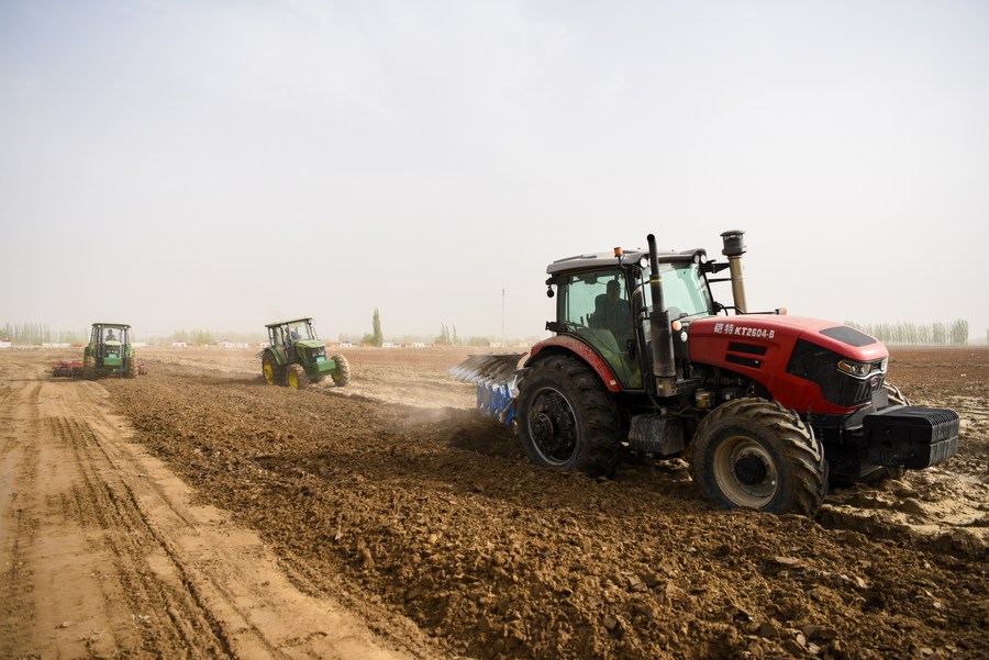 This photo taken on April 2, 2023 shows farming machines at work in a cotton field in Markit county, Northwest China's Xinjiang Uygur autonomous region. [Photo/Xinhua]
