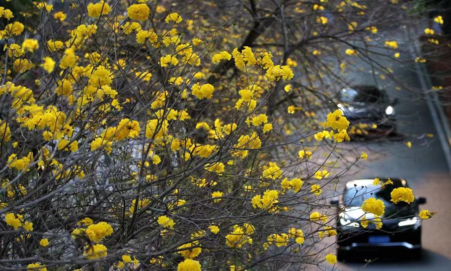Golden trumpet trees are blooming in Xiamen, Fujian province, attracting citizens and tourists, who take photos and feel the beauty of spring.