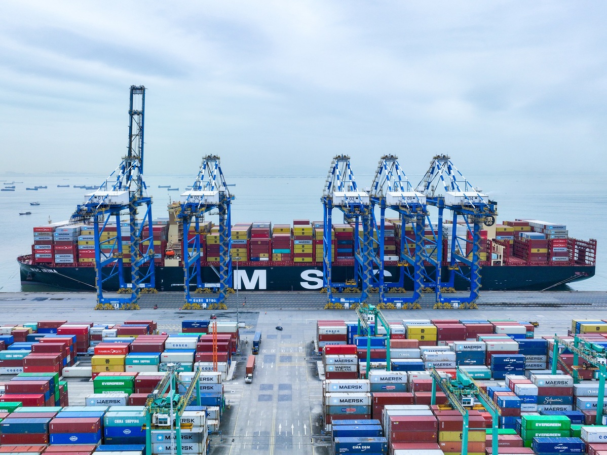The world's largest container ship, the MSC Irina, with a maximum container capacity of 24,346 TEUs, docked at Nansha Port in Guangzhou, Guangdong province, on Monday. [Photo by Li Qijun/For chinadaily.com.cn]