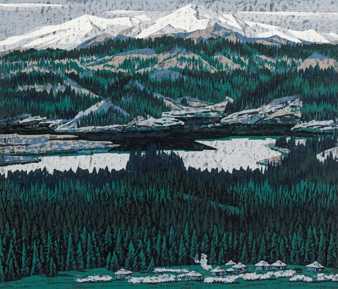 A print by Jin Xianglong depicting Tianchi Lake in Xinjiang, 1998 [Photo/Official WeChat account of the Xinjiang Art Museum]