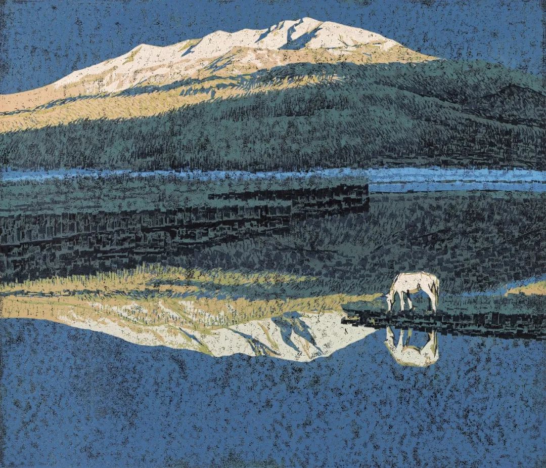 A print by Jin Xianglong portraying Sayram Lake in Xinjiang, 1998 [Photo/Official WeChat account of the Xinjiang Art Museum]
