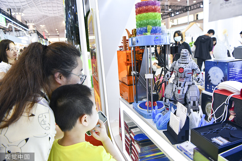 A boy and his mother observe a 3D printer printing a toy during the third China International Consumer Products Expo in Haikou, Hainan province on April 12, 2023. [Photo/VCG]
