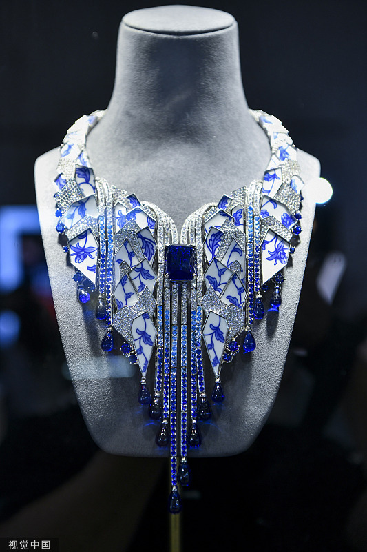 A precious necklace is on display at the third China International Consumer Products Expo in Haikou, Hainan province on April 12, 2023. [Photo/VCG]