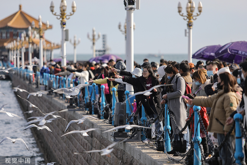 Tourists feed seagulls on a trestle in Qingdao, Shandong province, on March 17, 2023. [Photo/VCG]