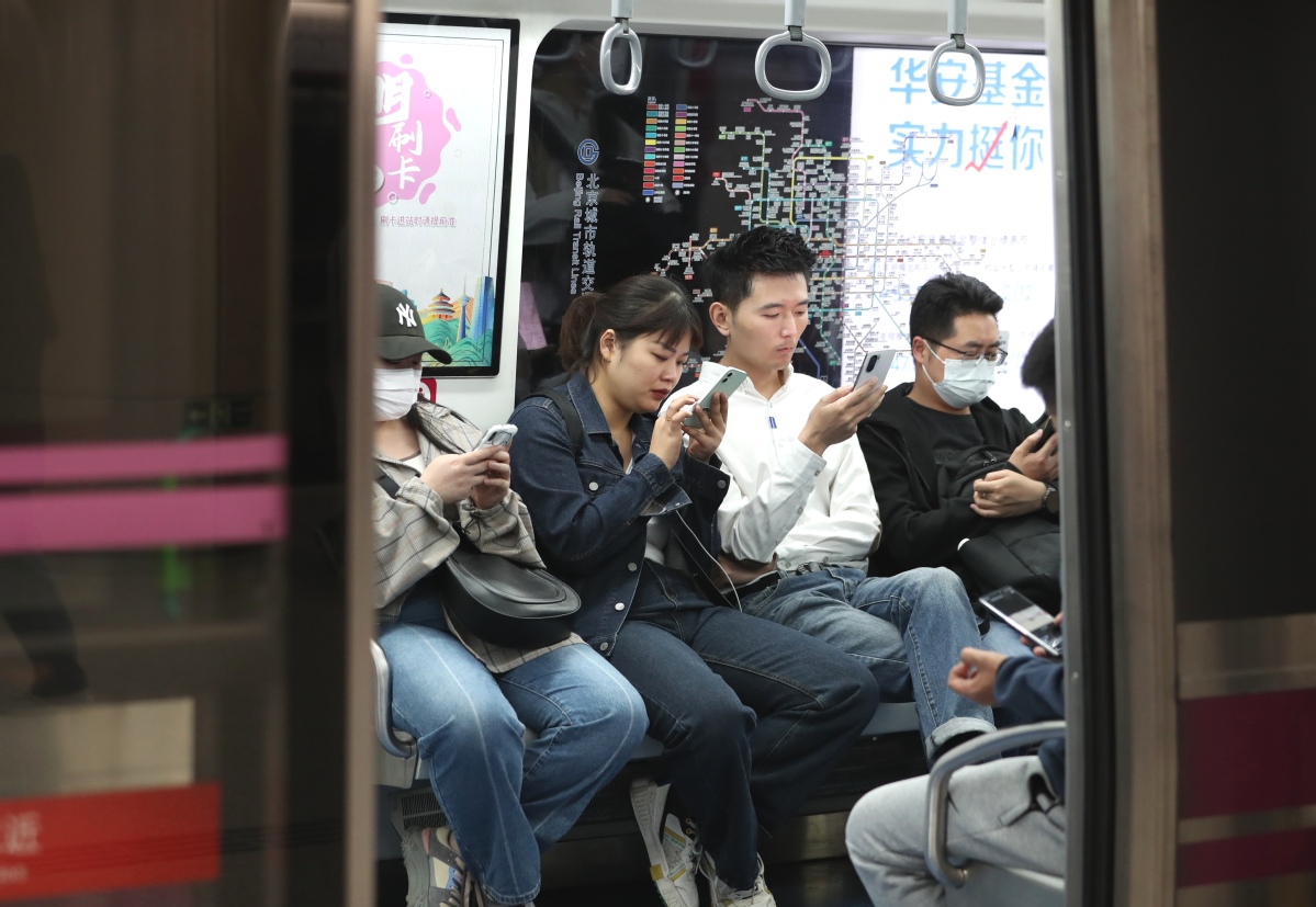 Some passengers do not wear masks while taking a subway train of Line 5 in Beijing on April 16, 2023. [Photo by Zou Hong/chinadaily.com.cn]