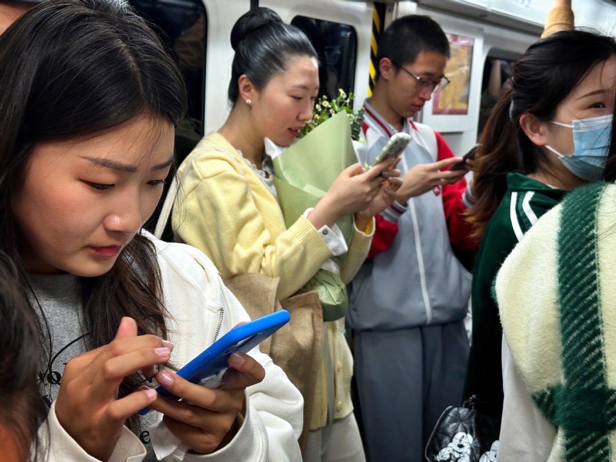 Some passengers do not wear masks while taking a subway train of Line 5 in Beijing on April 16, 2023. [Photo by Du Lianyi/chinadaily.com.cn]
