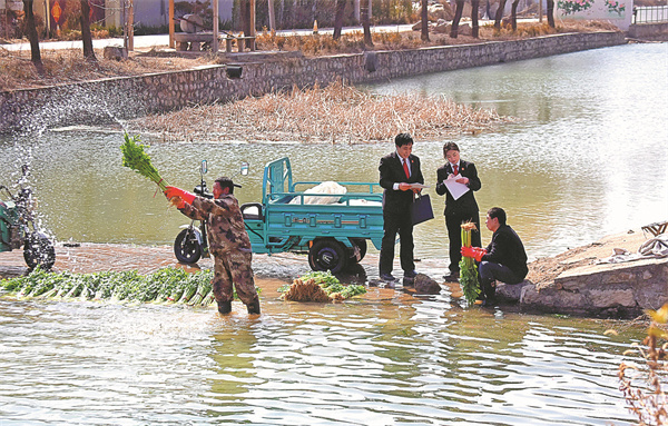 Court officers remind a vegetable farmer of possible risks related to trading near a village in Yuezhuang township on March 1. ZHAO DONGSHAN/FOR CHINA DAILY