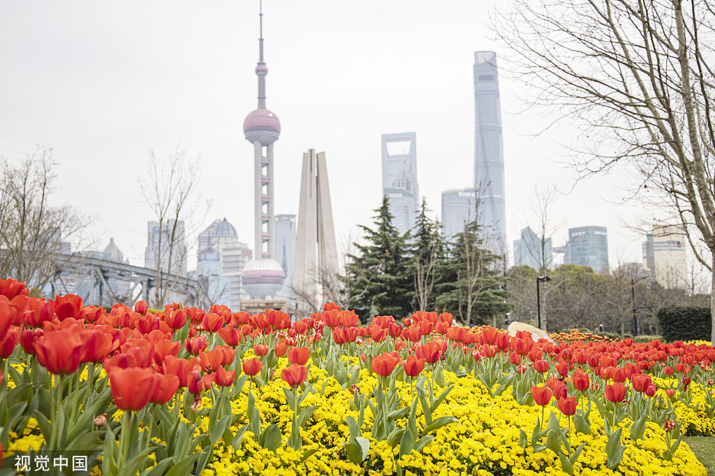 Tulips in bloom along the Bund area of Shanghai on March 15, 2023. [Photo/VCG]