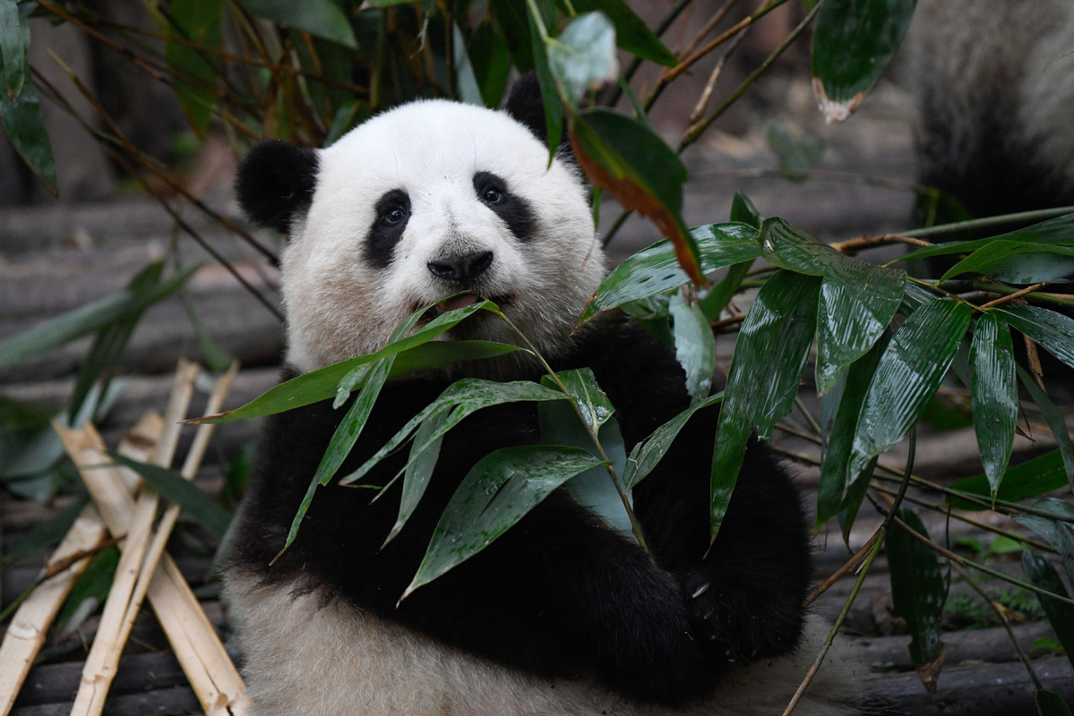 Giant panda He Hua eats fresh bamboo at the Chengdu Research Base of Giant Panda Breeding in Chengdu, Sichuan province, on March 22, 2023. [Photo/Xinhua]