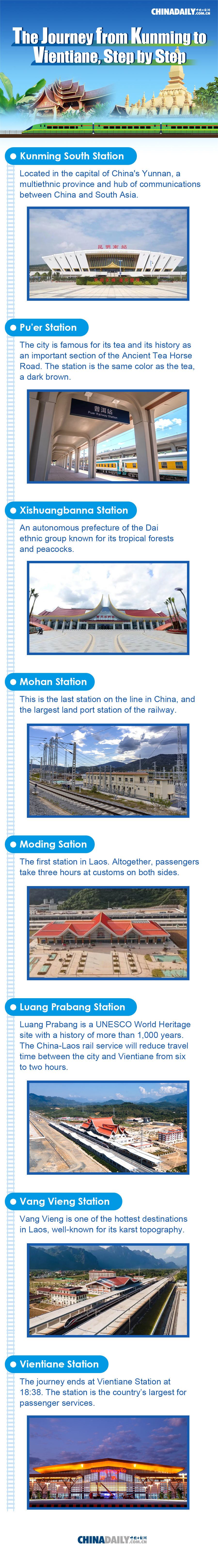 The long-anticipated international passenger service on the China-Laos Railway was put into operation on April 13. Starting from Kunming, capital of China's Yunnan province at 8:08 am, the D887 train takes ten and a half hours and stops at eight stations before arriving at Vientiane, capital of Laos. Let's check out every stop on the journey.