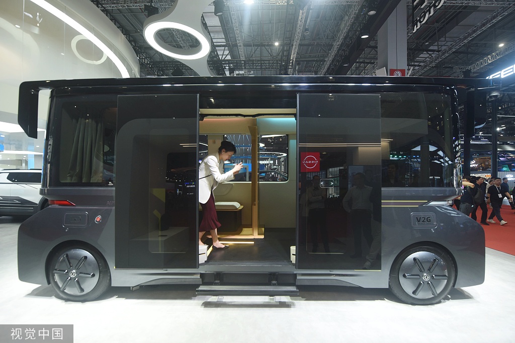 A visitor experiences an unmanned mini bus with hydrogen fuel cells at the 20th Shanghai International Automobile Industry Exhibition in Shanghai on April 18, 2023. [Photo/VCG]