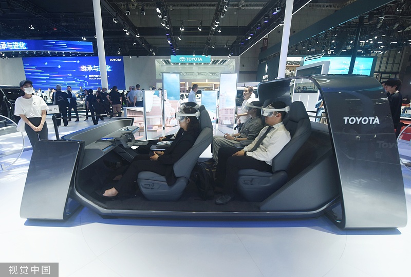 Visitors enjoy intelligent driving through VR glasses at the 20th Shanghai International Automobile Industry Exhibition in Shanghai on April 18, 2023. [Photo/VCG]