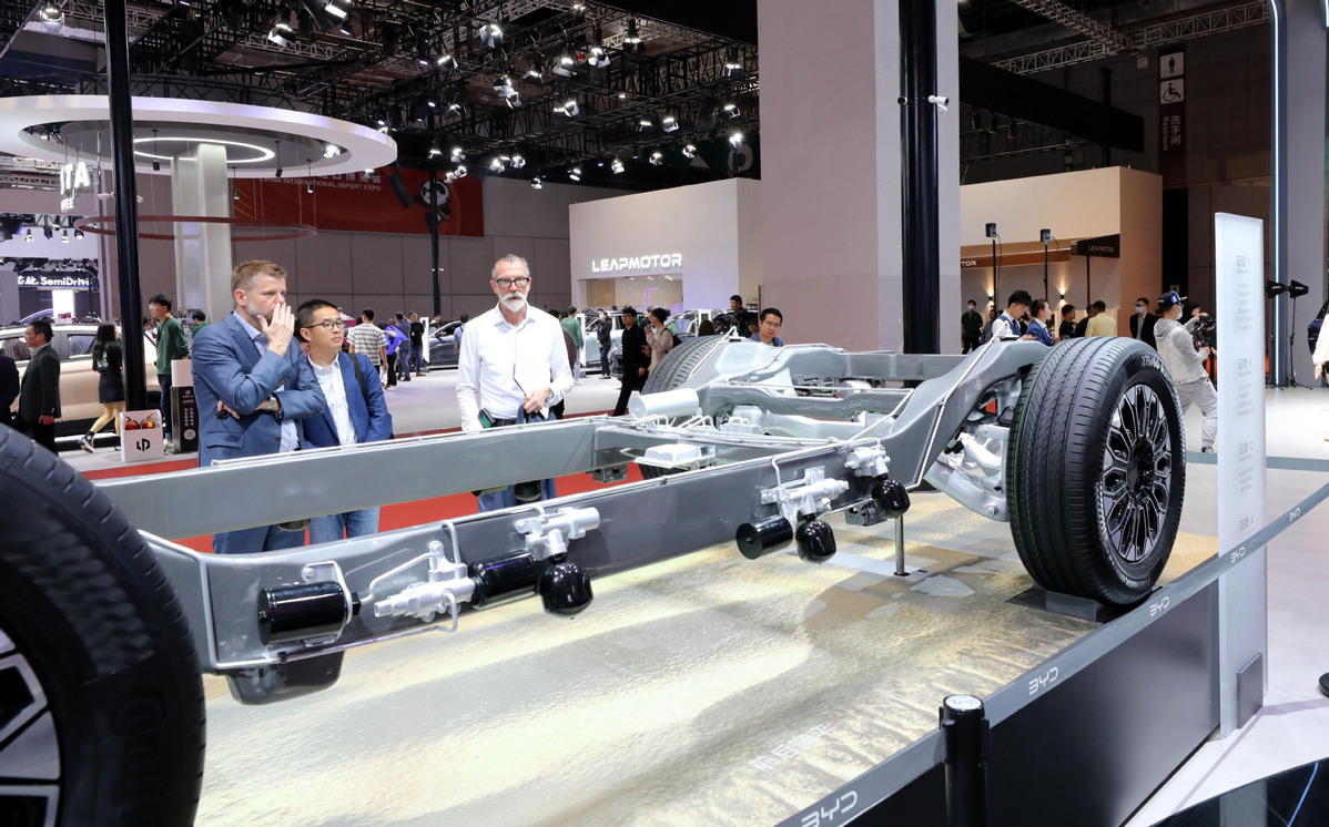 An intelligent hydraulic body control system by Chinese carmaker BYD is displayed at the 20th Shanghai International Automobile Industry Exhibition in Shanghai, April 19, 2023. [Photo/Xinhua]